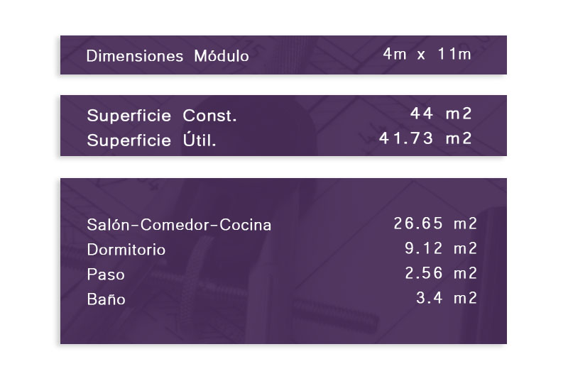Modelo de un módulo. Dispone de 41.73 m2 de superficie útil con salón-comedor-cocina, un dormitorio y un baño.