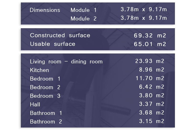 Model with two modules. This model has 65.01 m2 of usable space with a living room-dining room, kitchen, 3 bedrooms and 2 bathrooms.