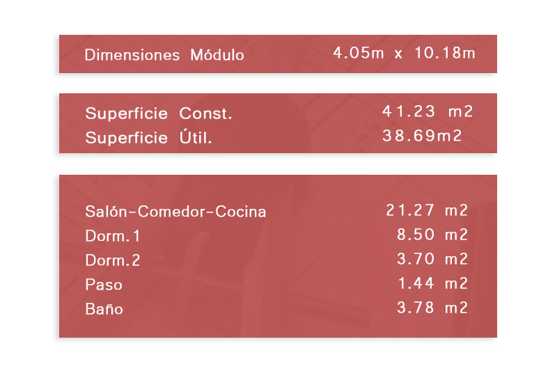 Modelo de un módulo. Dispone de 38,69 m2 de superficie útil con salón-comedor-cocina, dos dormitorios y un baño.