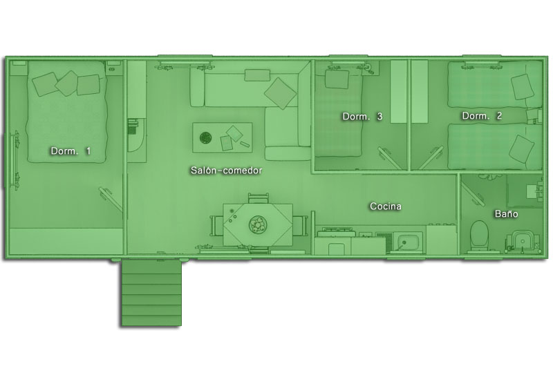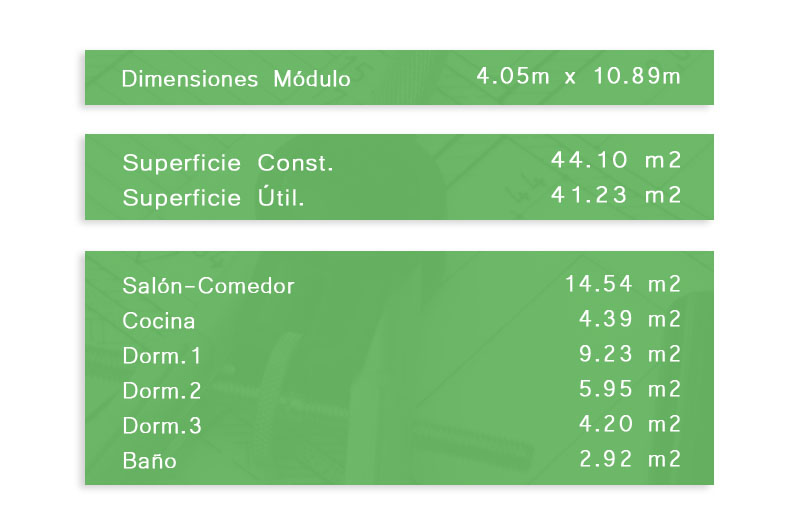 Modelo de un módulo. Dispone de 41,23 m2 de superficie útil con salón-comedor, cocina, tres dormitorios y un baño.