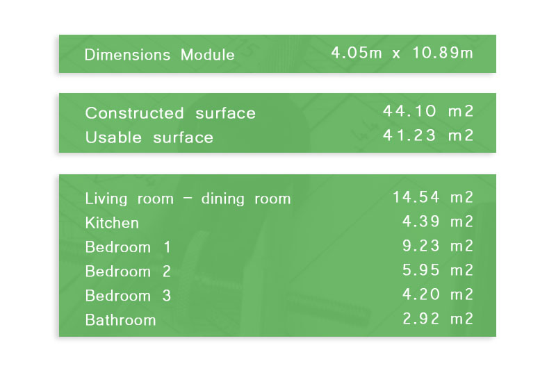 Model with one module. This model has 41.23 m2 of usable space with a living room-dining room, kitchen, 3 bedrooms and a bathroom.