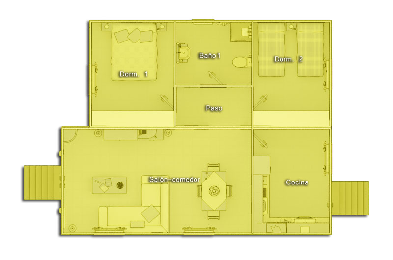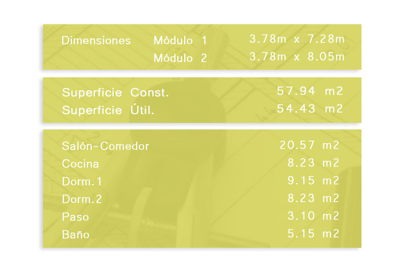 Modelo de dos módulos. Dispone de 54,43 m2 de superficie útil con salón-comedor, cocina, dos dormitorios y un baño.