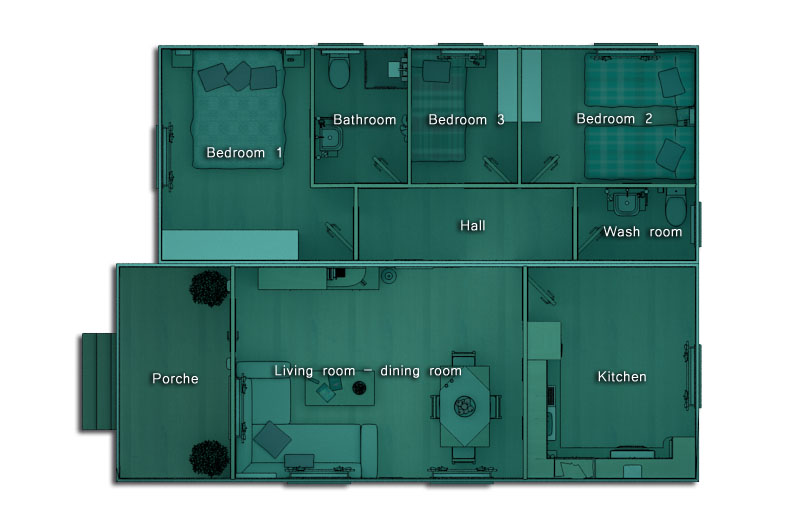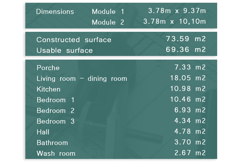 Model with two modules. This model has 69.36 m2 of usable space with a covered porch, living room-dining room, kitchen, 3 bedrooms, a bathroom and wash room.