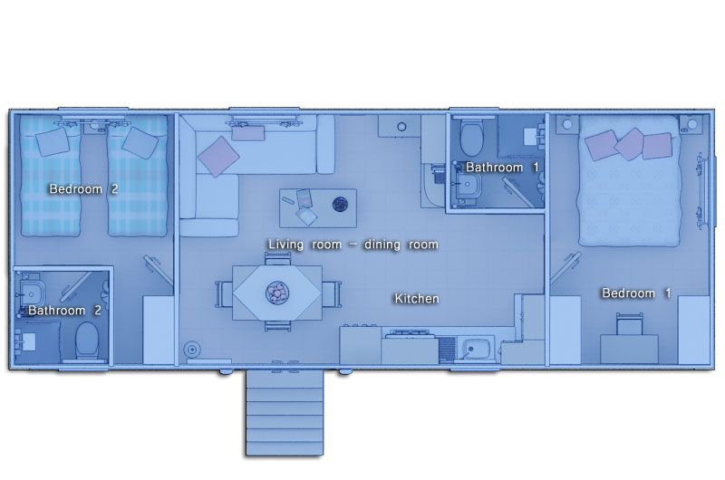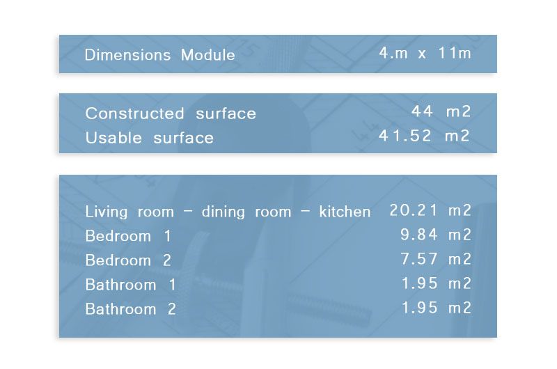 Model with one module. This model has 41.52 m2 of usable space with a living room-dining room-kitchen, 2 bedrooms and 2 bathrooms.