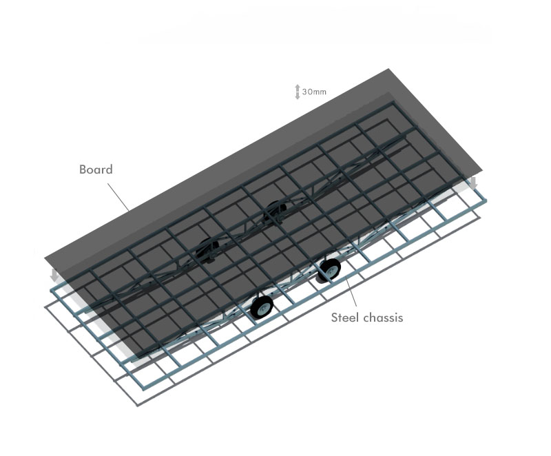 Portable module on a chassis with an axis with wheels and reversible drawbar in order to make movements easier when towing the mobile home. Reinforced steel chassis with additional treatment in order to provide optimal resistance against corrosion and weather conditions (manufactured according to EU regulation UNE-EN 10305-5) On the iron platform there is a 30 mm blocked mono board covered in a coating of PVC that strengthens the floor of the home.