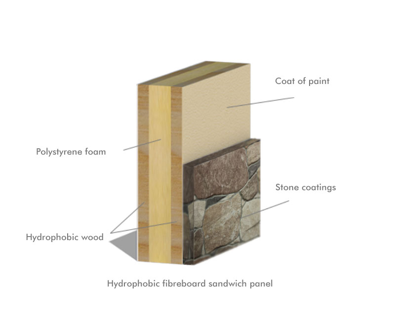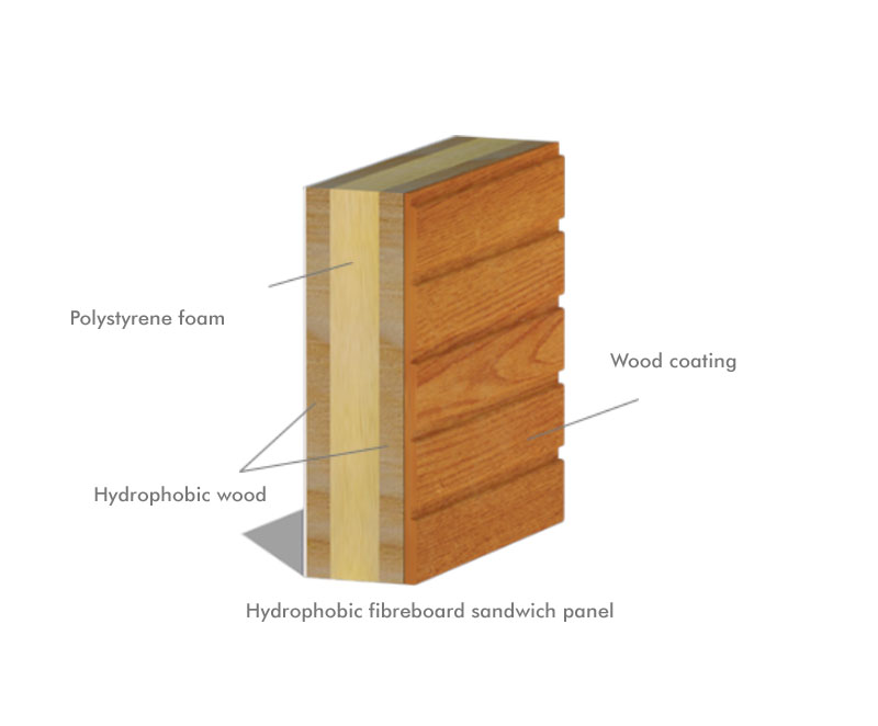 6 cm thick sandwich panel made up of two sheets of hydrophobic wood with polystyrene foam on the inside.