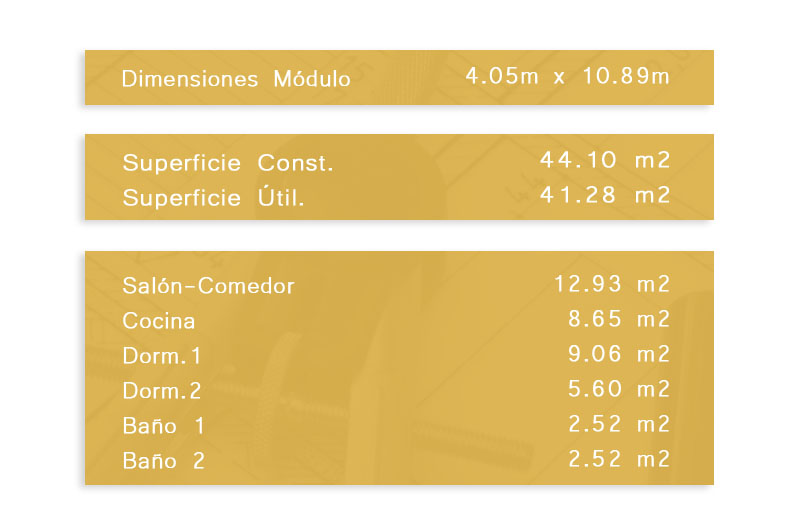 Modelo de un módulo. Dispone de 41,28 m2 de superficie útil con salón-comedor, cocina, dos dormitorios y dos baños.